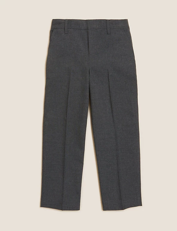 This two-pack of boys’ trousers will keep them feeling smart and comfortable in and out of the classroom. Regular fit with a straight cut leg for a classic, sharp look. As part of our Adaptive range, they have a pull-on waistband to make dressing a little easier. Crease-resistant fabric is also stain and weatherproof, so they keep their looks whatever the day brings. Grow-proof hems and an adjustable waist mean they’ll fit well through growth spurts. Made with recycled polyester and sustainable viscose.