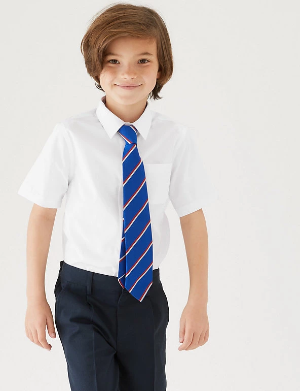 With more cotton than ever, our regular fit short sleeve school shirt comes in a handy two pack. Our ultimate school shirt is Non Iron and Stain Resistant, perfect for the day to day wear and tear of the school classroom. For those younger sizes (up to 8 years) these shirts feature our practical Easy Close top button – rip tape behind the top button making dressing simple. We are transitioning the polyester in this garment to recycled polyester. While we transition, customers may receive items made with either sustainable sourced cotton and recycled polyester or just sustainable sourced cotton and polyester.