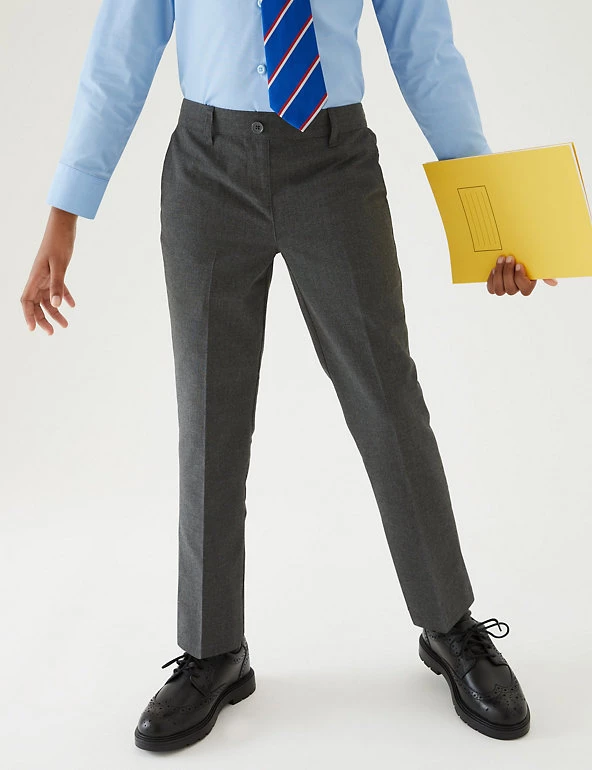 See them through the school week with this two-pack of trousers. Regular fit with a slim leg shape for a sharp look. As part of our Adaptive range, they have concealed labels and a pull-on waistband to make dressing a little easier. Crease-resistant fabric is also stain and weatherproof, so it keeps its looks whatever the day brings. Grow-proof hems and an adjustable waist mean these trousers will fit well through growth spurts. Made with recycled polyester and sustainable viscose.