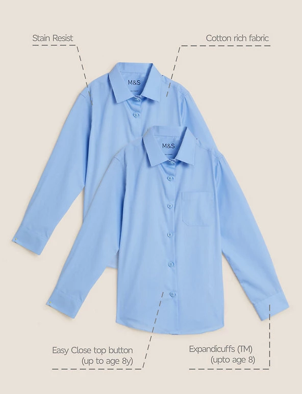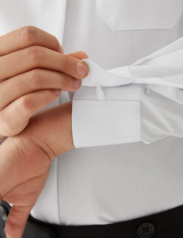 With more cotton than ever, our regular fit long sleeve school shirt comes in a handy two pack. Our ultimate school shirt is Non Iron and Stain Resistant, perfect for the day to day wear and tear of the school classroom. For those younger sizes (up to 8 years) these shirts feature our practical Expandicuff™ cuffs and Easy Close top button. We are transitioning the polyester in this garment to recycled polyester. While we transition, customers may receive items made with either sustainable sourced cotton and recycled polyester or just sustainable sourced cotton and polyester.