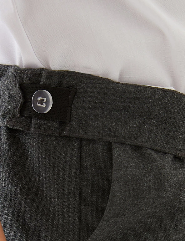 These school trousers come in a handy pack of two to see them through the week. Classic regular fit with a modern skinny leg. Grow-proof hems and an adjustable waist will help them fit all year long. Made from crease-resistant material that won’t crumple throughout the day. Stain & weatherproof technology provides a durable finish that helps stop stains from forming. Made with recycled polyester and sustainable viscose.