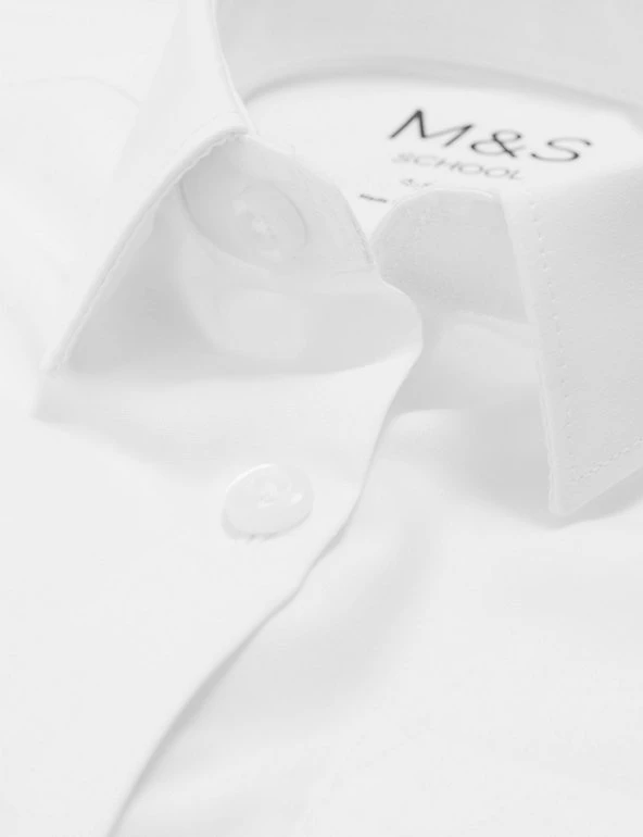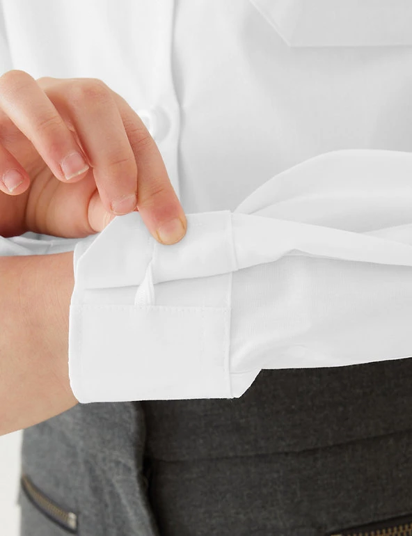 Our two pack of long sleeve school shirts is the perfect school uniform staple. With more cotton than ever and featuring Non Iron and Stain Resistant finishes, these school blouses are easy to keep looking their best, and the slim fit cut gives a narrower finish through the body for a flattering and fashionable look. In sizes below 8 years, the top button has an Easy Close mechanism for straightforward dressing, and our patented Expandicuff™ sleeves that easily stretch to be slipped on and off. We are transitioning the polyester in this garment to recycled polyester. While we transition, customers may receive items made with either sustainable sourced cotton and recycled polyester or just sustainable sourced cotton and polyester.
