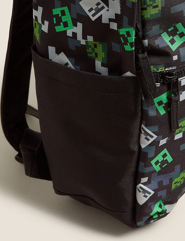Add an extra dose of fun to their school day with this water repellent zip-up Minecraft™ backpack. Made with wide padded straps that are curved for a comfy fit against the body. This roomy backpack is big enough to fit A4 folders and features a side pocket for a water bottle, as well as a front zipped pocket and interior compartments for stationery. Extra padding in the back enhances comfort, while two top handles offer another way to carry it. Name and class label on the inside. Machine washable for easy cleaning.