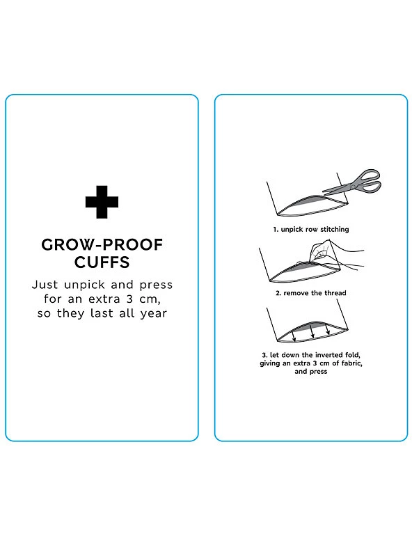 Cuff hem can be unpicked and let down a further 3cm to allow for growth.
