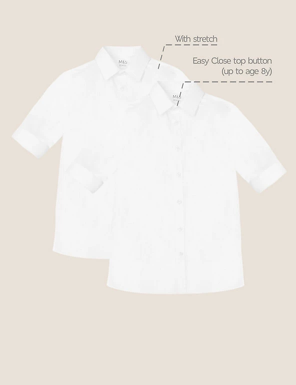 Smart style meets convenience with this two pack of school shirts. They’re cut to a close-fitting skinny shape, with added stretch for extra comfort. Easy to Iron technology means a quick press and away you go. For those younger sizes (up to 8 years) these shirts feature our practical Easy Close top button. We are transitioning the polyester in this garment to recycled polyester. While we transition, customers may receive items made with either sustainable sourced cotton and recycled polyester or just sustainable sourced cotton and polyester.
