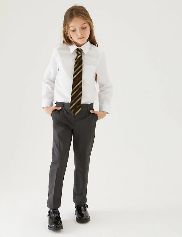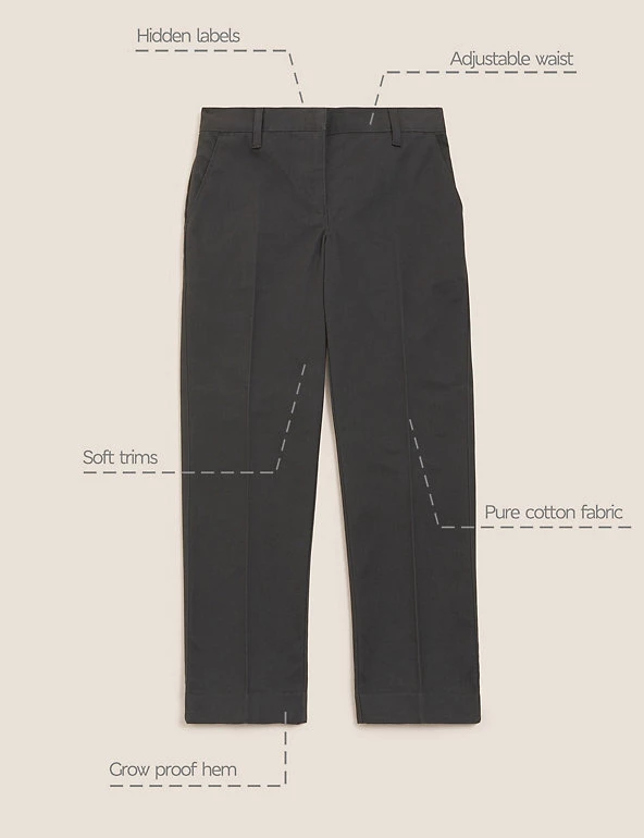 These school trousers are designed to make sure kids stay comfy all day. Made from soft, pure cotton in a classic fit with regular-cut legs. An adjustable waist and grow-proof hems will help them fit all year long. Specially designed for sensitive skin with flat seams and no rough labels or finishes. We only ever use responsibly sourced cotton for our clothes.
