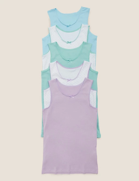 Stock up for winter with this five-pack of vests. Made from soft and breathable cotton. Contains a mix of plain and spotted designs, each finished with a dainty lace trim and centre bow. We only ever use responsibly sourced cotton for our clothes.